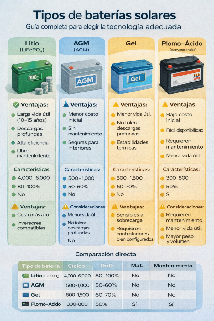 Si tu prioridad es rendimiento, seguridad y larga vida útil, las baterías de litio LiFePO₄ son actualmente la mejor inversión para sistemas solares residenciales.
