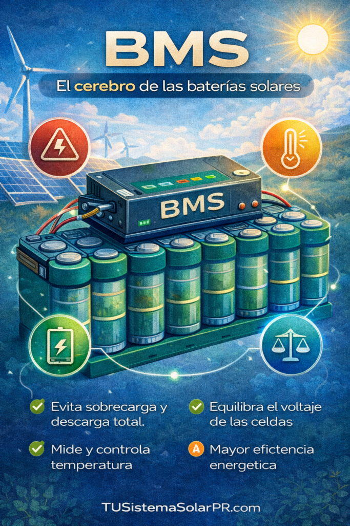 Las baterías solares de litio están diseñadas con sistemas inteligentes de protección integrados llamados BMS (Battery Management System), que controlan: