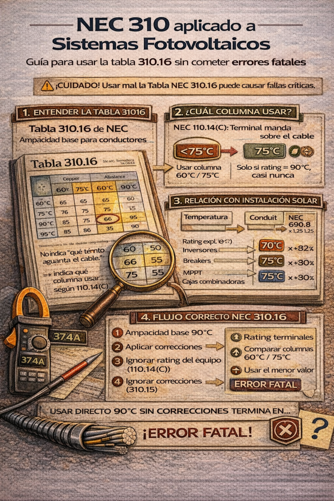 📘 En sistemas solares, NEC 310 sin NEC 690 es un diseño incompleto.