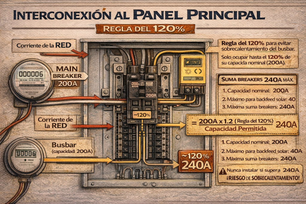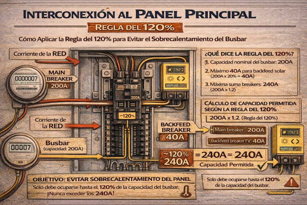 4️⃣ La famosa regla del 120% (NEC 705 explicada sin estrés)
